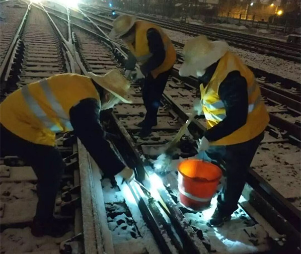 图为铁路工作人员清理道岔积雪