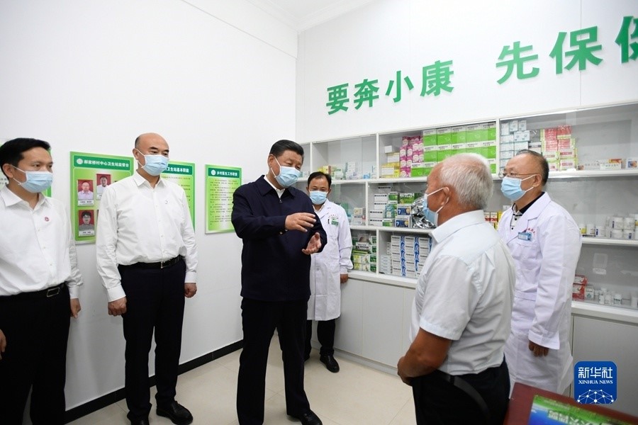 9月13日至14日,中共中央总书记、国家主席、中央军委主席习近平在陕西省榆林市考察。这是14日下午,习近平在绥德县张家砭镇郝家桥村卫生站同村里的老人、医护人员亲切交流。新华社记者 李学仁 摄