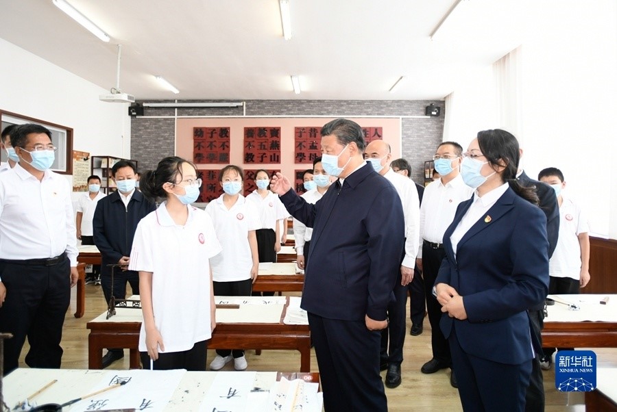 9月13日至14日,中共中央总书记、国家主席、中央军委主席习近平在陕西省榆林市考察。这是14日上午,习近平在绥德实验中学考察时,同正在练习书法的学生亲切交流。新华社记者 李学仁 摄